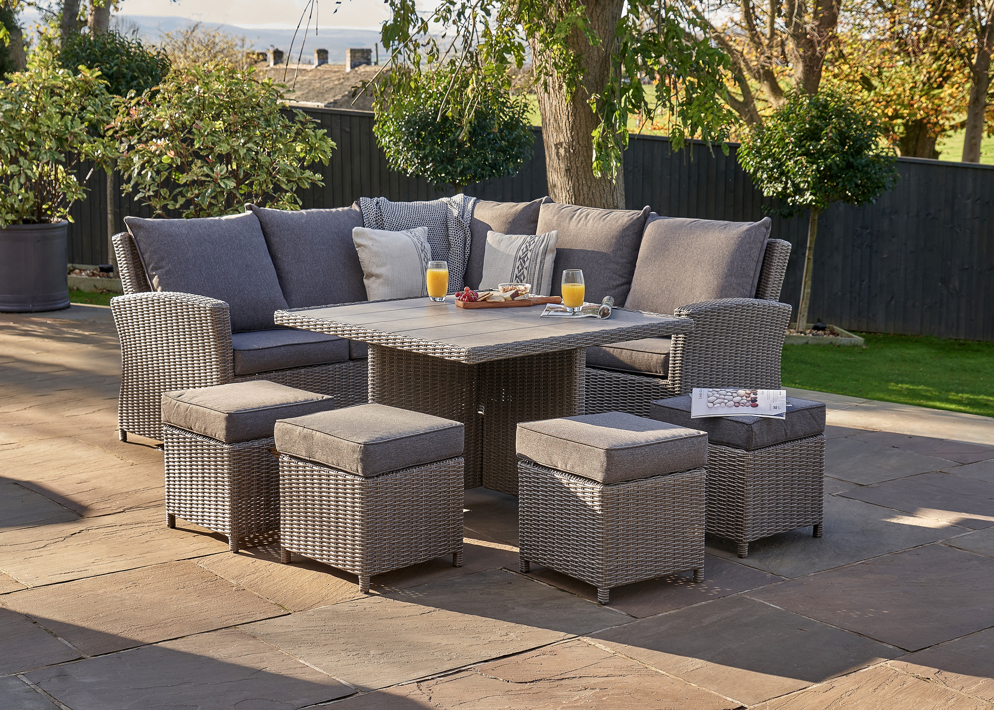 - Spacious corner seating with season proof, fire retardant cushions