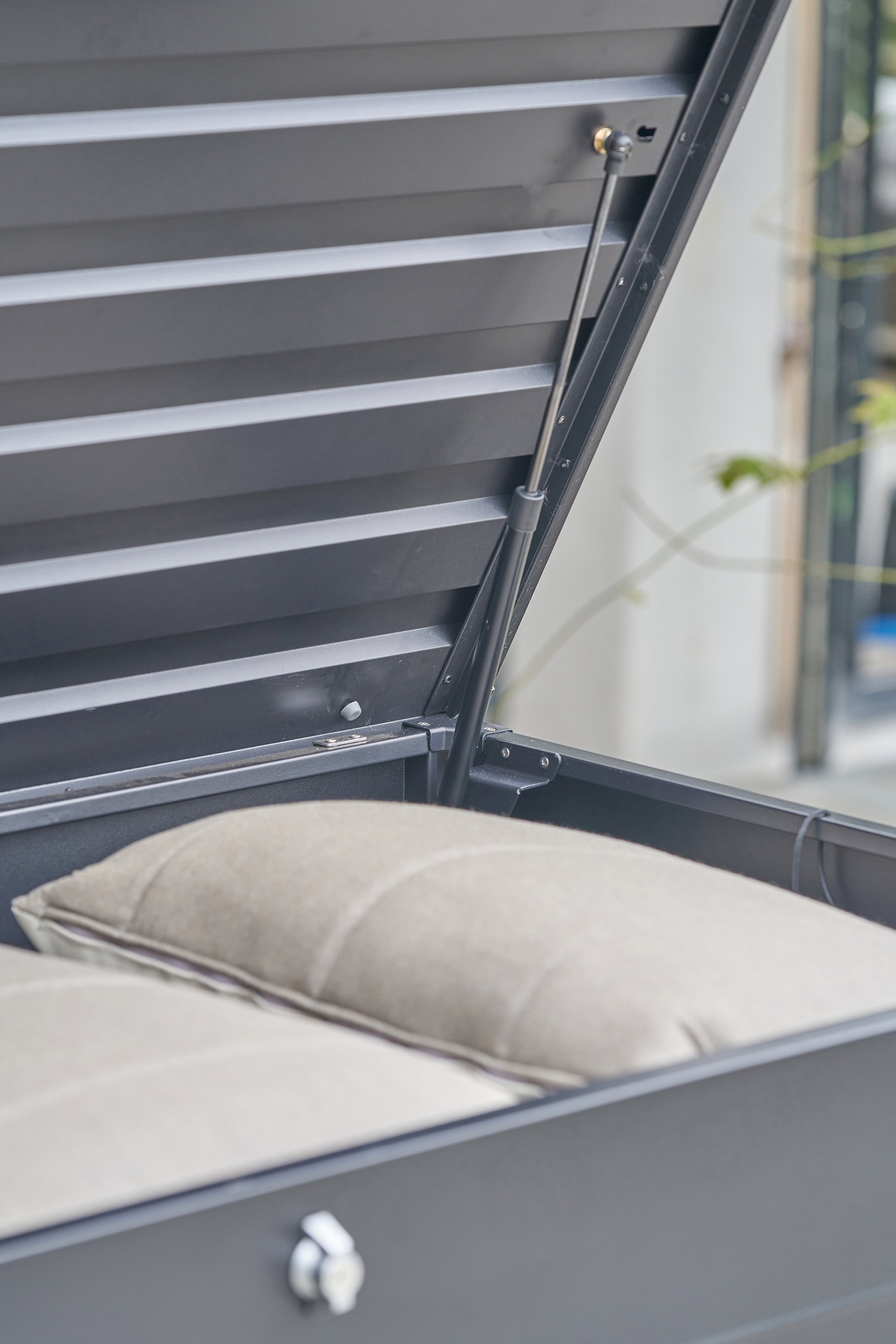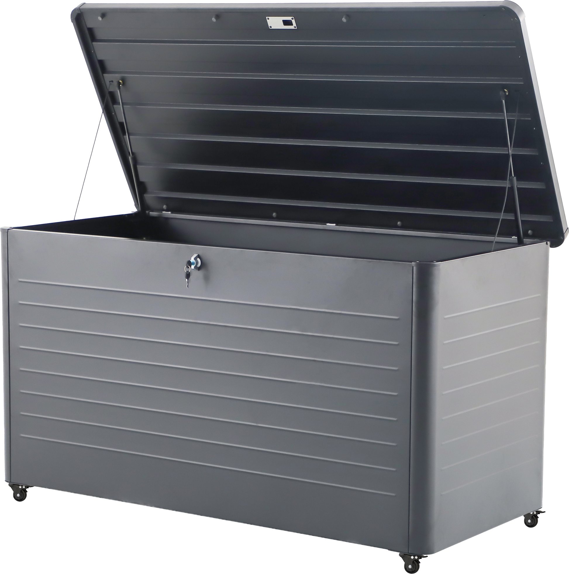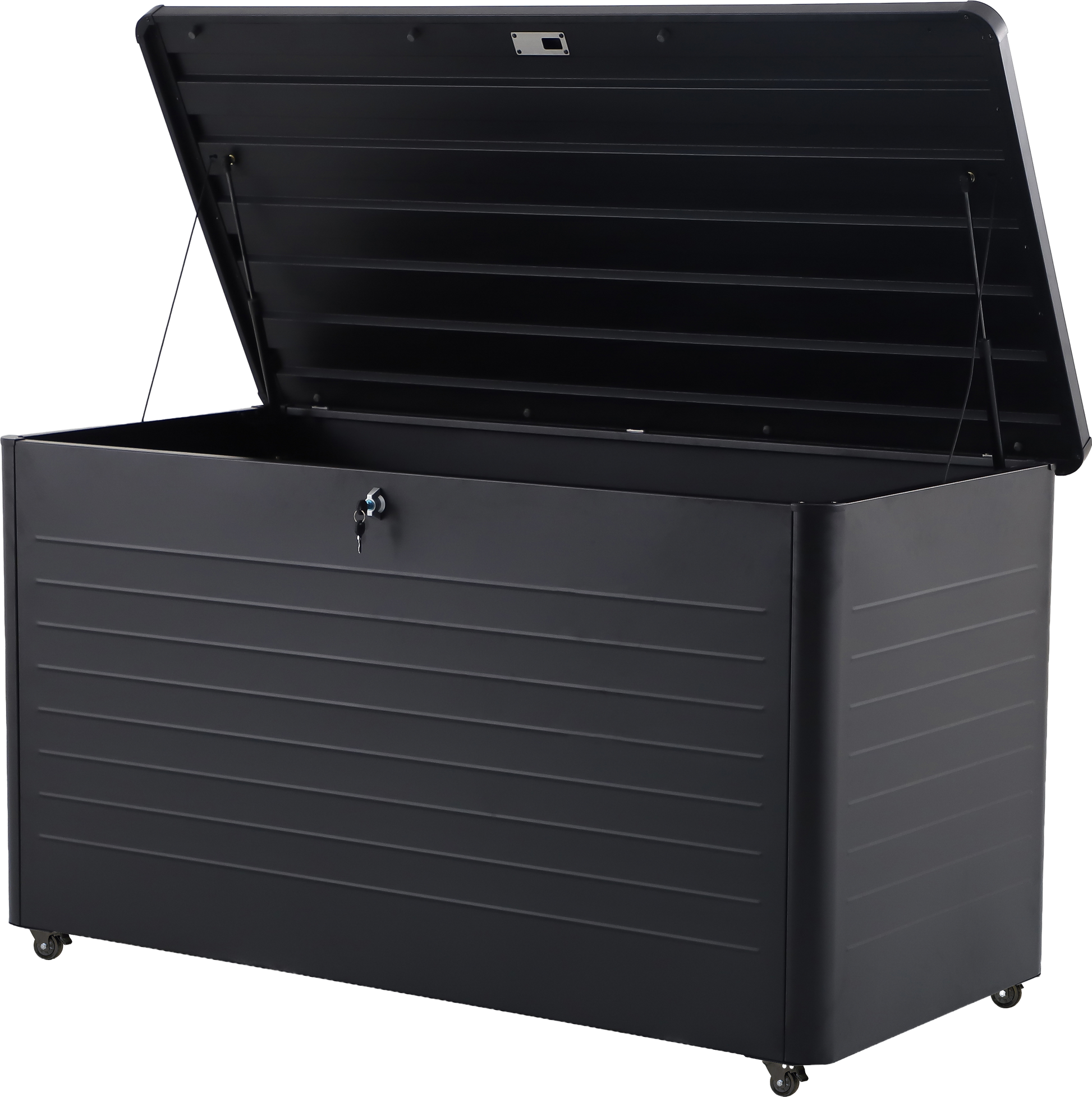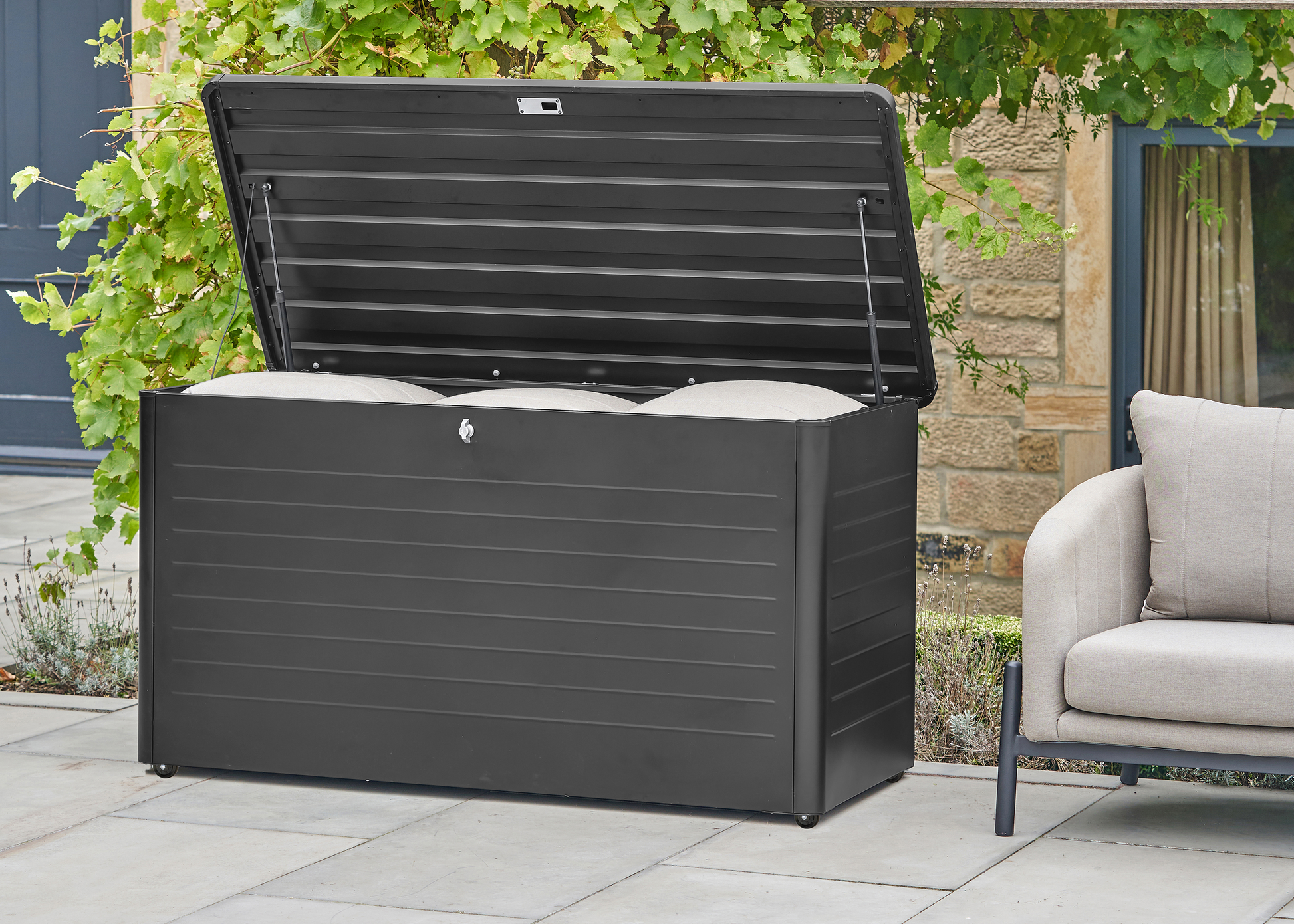 The Rhode Island Large Steel Cushion Box is made from galvanised steel, perfectly formed to store your cushions whilst not in use, in a black hue. The outdoor storage box features a contemporary slim, close-lat design, with gas pump hinges and adjustable feet for ease of movement when required. There is also a lock and key for your security.