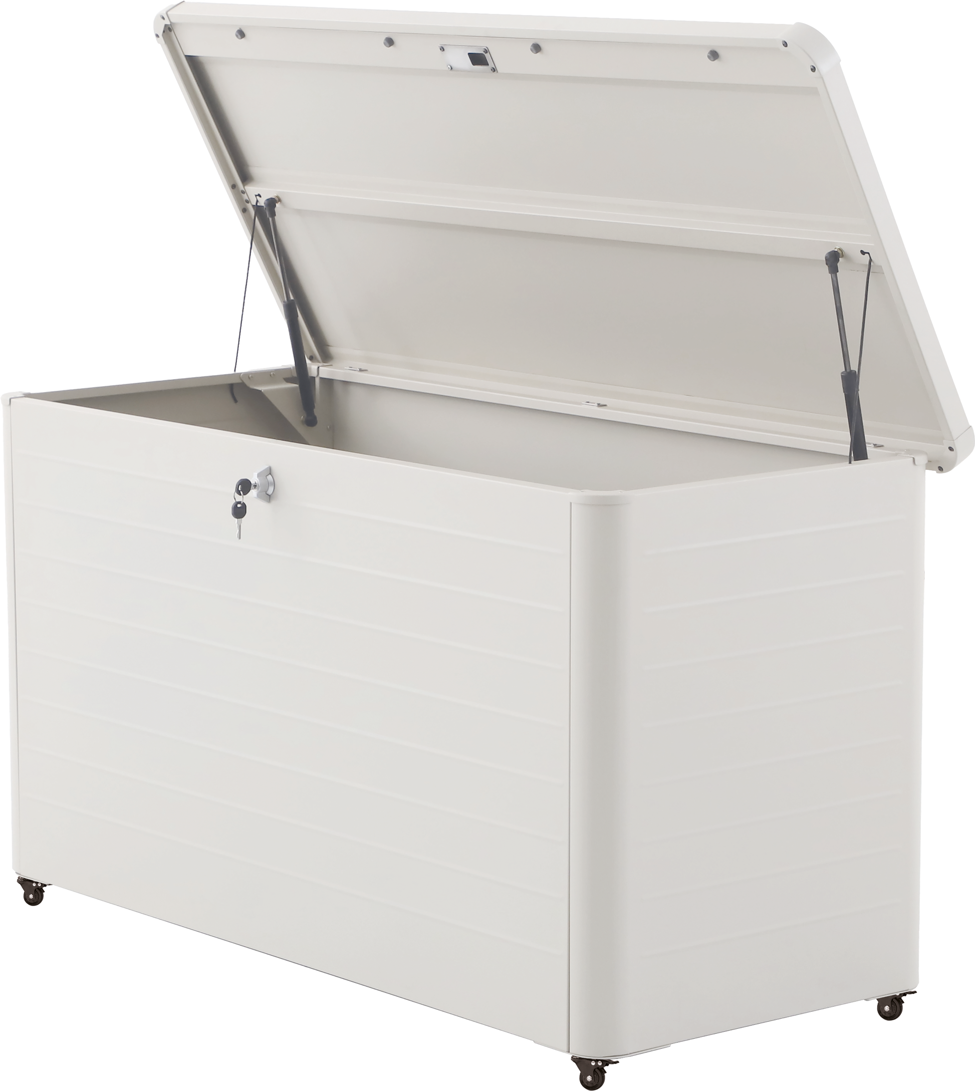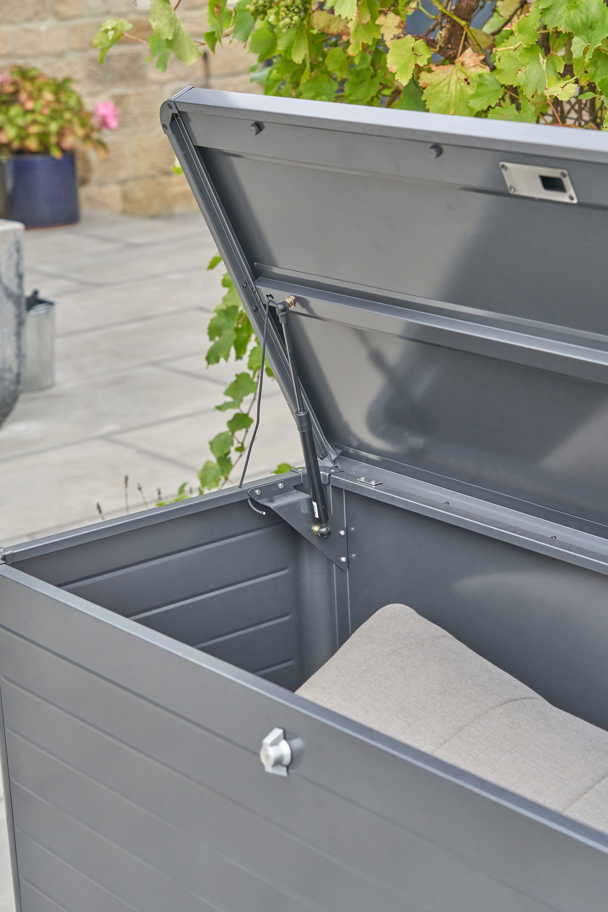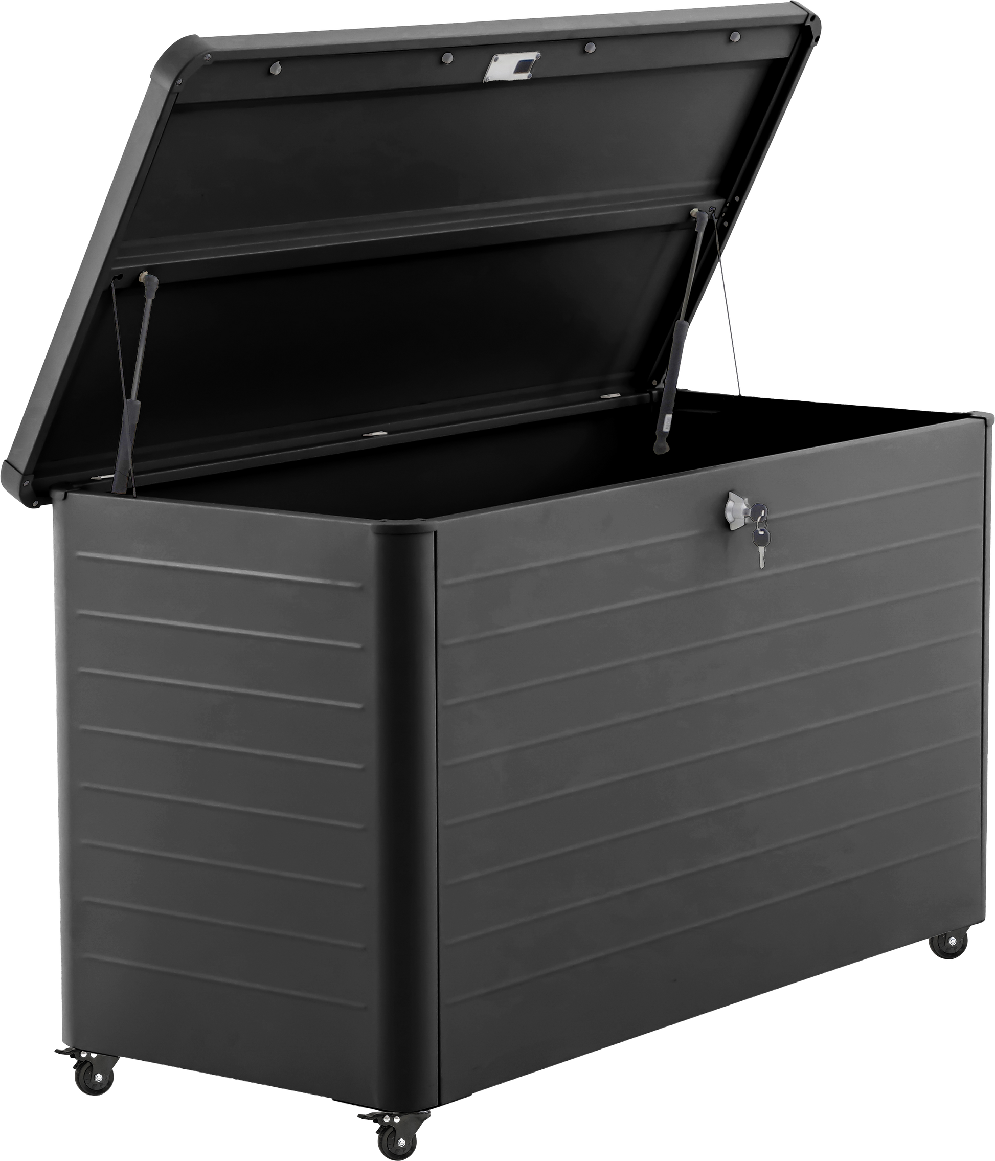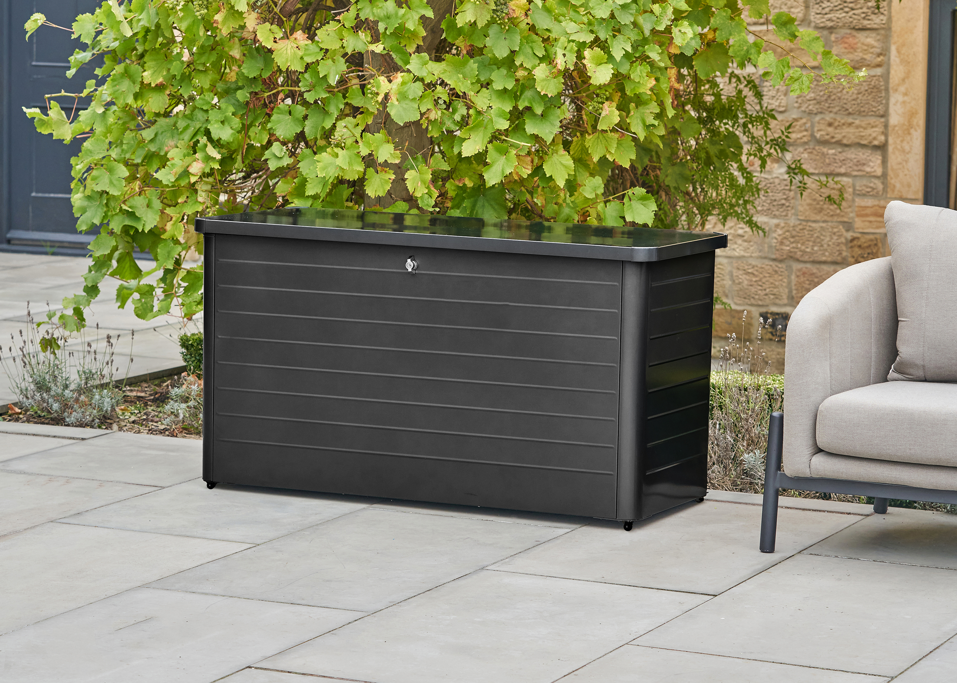 The Rhode Island Small Steel Cushion Box is made from galvanised steel, perfectly formed to store your cushions whilst not in use, in a black hue. The outdoor storage box features a contemporary slim, close-lat design, with gas pump hinges and adjustable feet for ease of movement when required. There is also a lock and key for your security.
